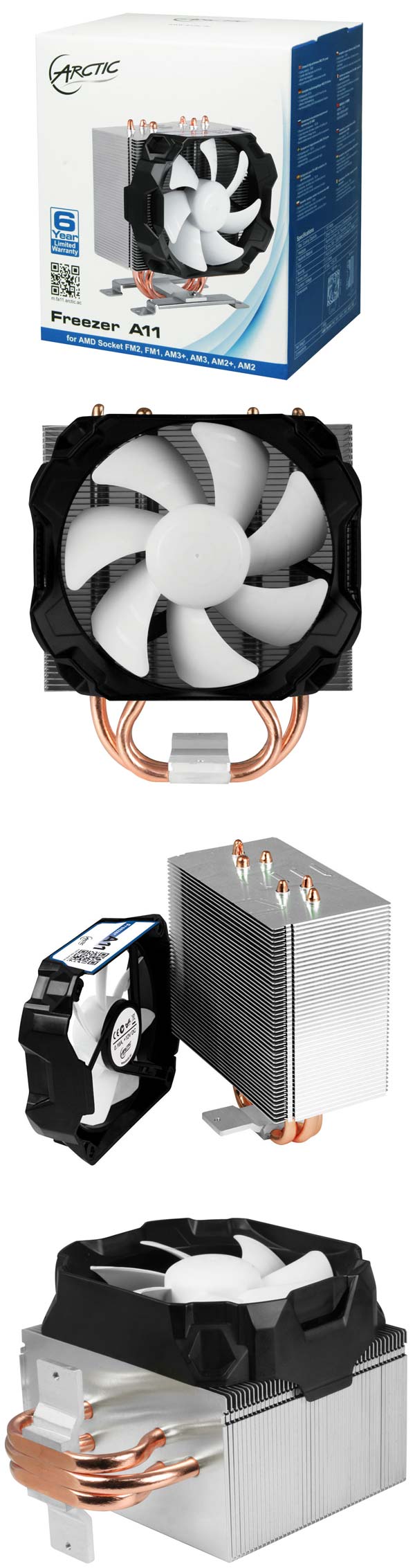Уровень шума от "вертушки" равен 0.3 сон, воздушный поток - 74 кубических фута в минуту, потребляет вентилятор 1.92 ватта электроэнергии. Размеры кулеров Freezer A11 и i11 составляют 100x90x130мм, вес равен 480 граммам.
