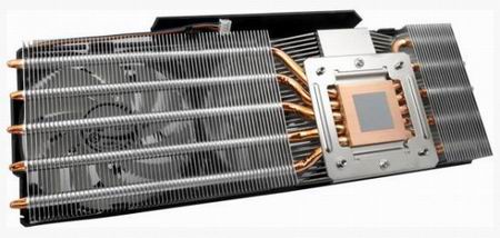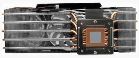 Данная система охлаждения представляет из себя массивный радиатор с медным основанием, из которого идут пять теплотрубок, пронизывающие 84 алюминиевых ребра. Всё это хозяйство обдувают три 92мм вентилятора, скорость вращения лопастей которых колеблется от 900 до 2000 оборотов в минуту и зависит от температуры ядра карты (конечно же, её можно регулировать и программным методом). Уровень шума - 0.5 сонов (мне привычнее в децибелах). В конструкции "карлсонов" применены фирменные гидродинамические подшипники, обеспечивающие долгий срок службы и отсутствие призвуков при работе.