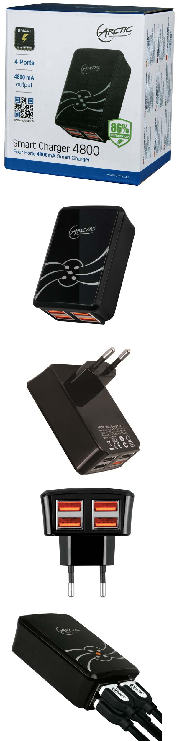Сейчас в ходу портативные зарядные устройства, так называемые "пауэр бэнки", но ARCTIC представила аппарат исключительно для домашнего/офисного применения, т.к. Smart Charger 4800 требует подключения к розетке электросети. Устройство выдаёт 5V/2900mA по каждому из четырёх своих USB портов, общая мощность аппарата - 4800 мАч.