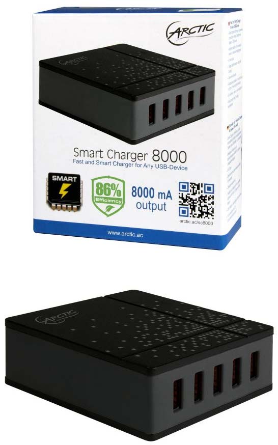 Smart Charger 8000 внешне напоминает USB хаб с пятью портами, однако такой функции он не выполняет, может лишь заряжать те или иные гаджеты. В пресс-релизе говорится, что агрегат распознает, уж не знаю каким образом, каждое подключенное устройство, дабы заряжать его на максимально доступной скорости.