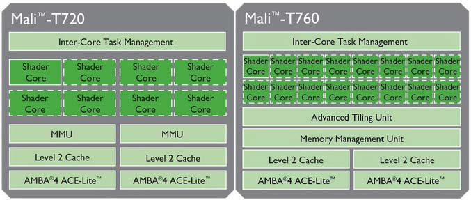 Решение Mali-T760 на 400% более энергоэффективное, чем Mali-T604, оно имеет шейдерных 16 ядер, вдвое больше чем у Mali-T678. Применяться решение будет не только в планшетах и смартфонах, но и компьютерах, основанных на ARM архитектуре. GPU Mali-T720 среднего уровня, оно на 150% энергоэффективнее Mali-400, занимает на 30% меньшую площадь, поддерживает OpenCL и RenderScript API.