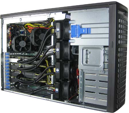 Насколько он доступны - мне сказать сложно, ибо стоимости в пресс-релизе указано не было. В основе высокопроизводительной новинки лежат два процессора Intel Xeon Processor W5590, три nVidia Tesla C2075 и одна nVidia Quadro 6000. Количество оперативной памяти не указано, но подозреваю, что оно впечатляющее, т.к. в основе суперкомпьютера лежит 7046GT-TRF-TC4 от Supermicro, а эта прелесть может вмещать в себя до 192ГБ "оперативки". Всё это великолепие охлаждается большим количеством СВО закрытого типа от Asetek, на фото ниже это хорошо видно.