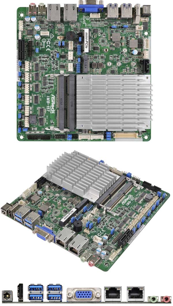 Решение называется ASRock IMB-157, эта плата имеет форм-фактор Mini-ITX, обладает сокетом BGA1296, слотами mini PCIe и PCIe (по-одному каждого типа). На новинку можно установить до 16 гигабайт оперативной памяти DDR3L SO-DIMM, частотой до 1867МГц. В наличии видеовыходы LVDS, VGA и HDMI, первые два поддерживают разрешение до 1920x1200 (до 60Гц), последний - до 4096x2160 (24Гц).