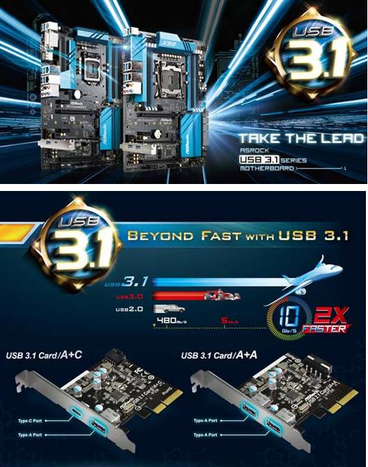В этот раз решила отличиться ASRock, она предлагает в комплекте со своими материнскими платами Z97 Extreme6/3.1 (LGA1150) и X99 Extreme 6/3.1 (LAG2011-3) карты PCIe 2.0 x4, дающие поддержку USB 3.1. Однако карты расширения функционала разные у системных плат - на первой находятся порты type-A (обычный) и type-C (новый тип, анонсированный недавно), на второй плате оба порта type-A.