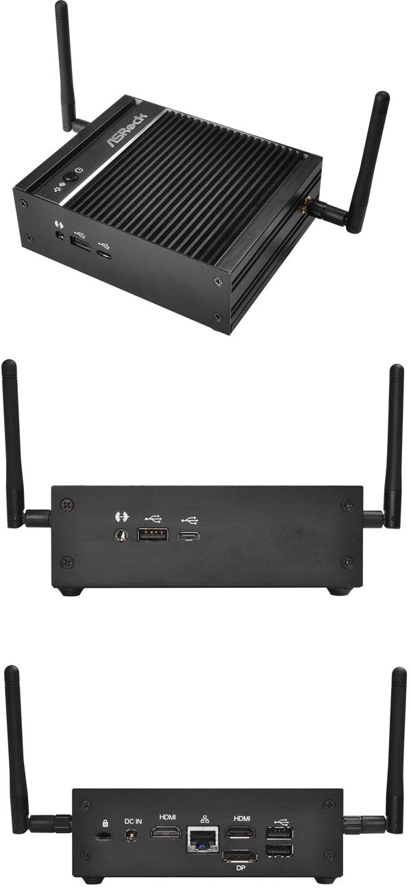Устройство использует сетевую карту на базе чипа Realtek RTL8111G, обладает четырьмя портами USB 3.0, из них три Type-A, а один - Type-C, в наличии также комбинированный аудиовход и аудиовыход. Видеовыходы: два HDMI и один DisplayPort, управлять таким компьютером может Windows или Linux.
