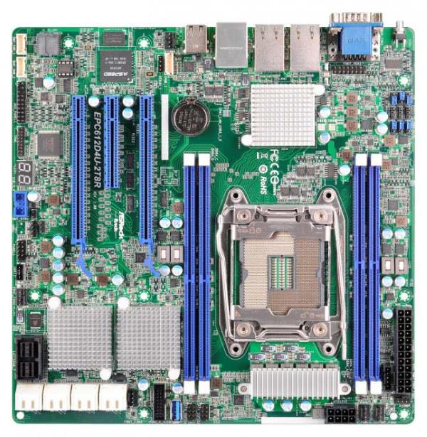 Новинка именуется EPC612D4U-2T8R, её форм-фактор - microATX, количество сокетов LGA 2011-3 равно одному, совместим аппарат с процессорами Intel Xeon E5 v3. На плате можно найти четыре слота для памяти DDR4 (2133 или 1866МГц, ECC DIMM, R DIMM или LR DIMM), шесть портов SATA 6Гб/с с поддержкой RAID 0, 1, 5, 10, а также два SATA 6Гб/с с поддержкой RAID 0 и 1.