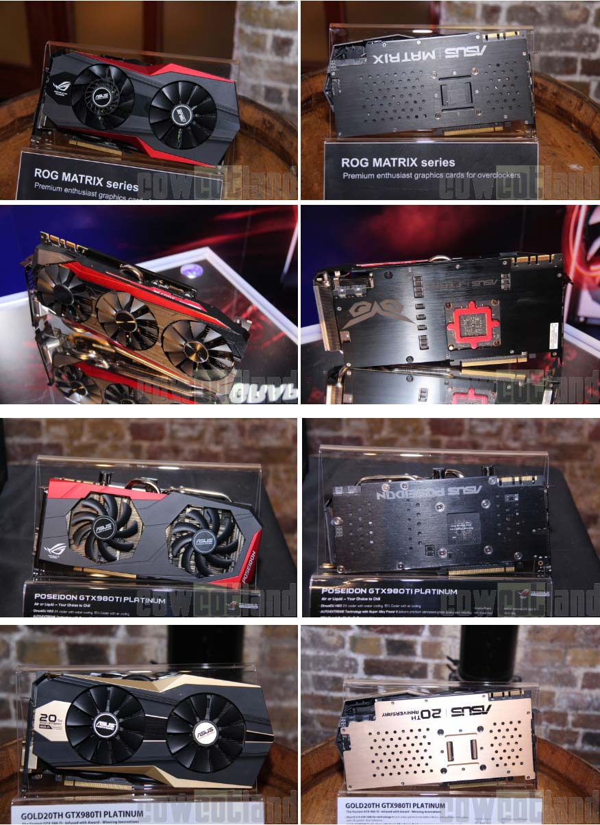 Из всей этой честной компании частоты известны лишь для POSEIDON GTX 980 Ti Platinum с кулером DirectCU H20, ядро карточки работает на 1114МГц в базовом режиме, на 1203МГц в Boost, память же зафиксирована на 7ГГц. В карточке STRIX GTX 980 Ti применена новая система охлаждения DirectCU III, умеющая полностью выключаться в простое или же при малой нагрузке. Новинка в лице GTX 980 Ti 20th Anniversary Edition Gold Platinum является перекрашенной версией ROG MATRIX, возможно с более высокими рабочими частотами.