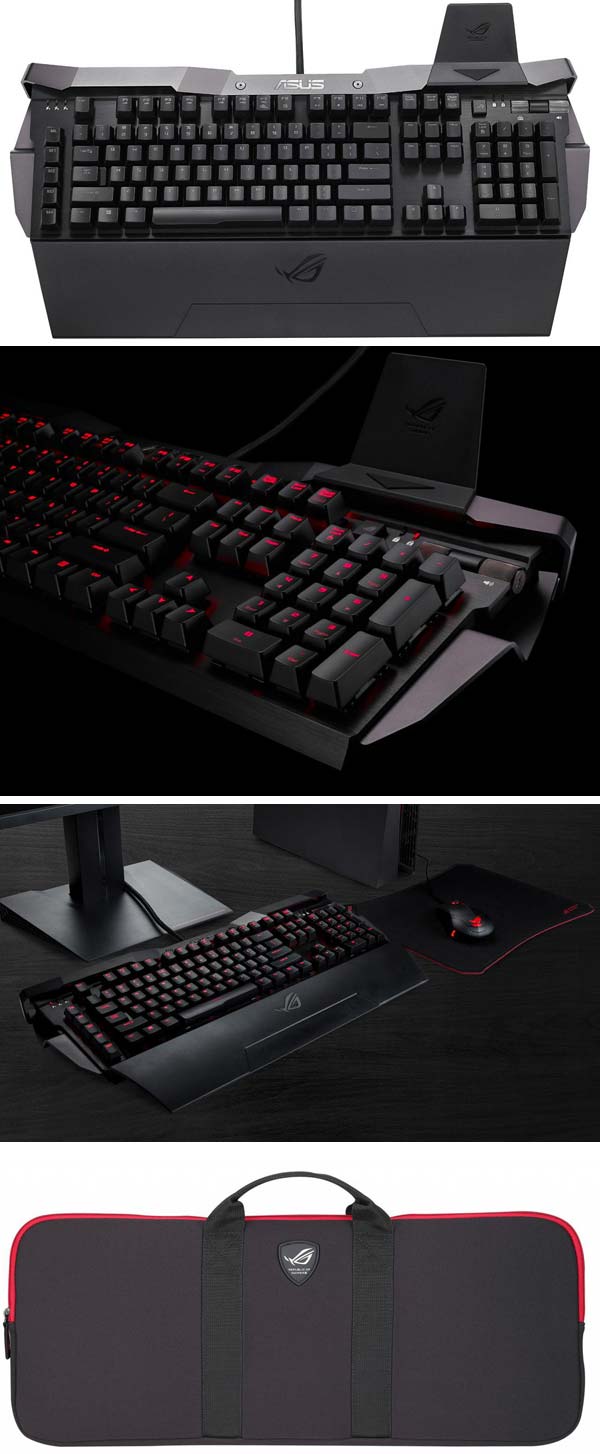 Изделие ASUS использует некий 32-разрядный блок многоадресного управления, а также 4МБ встроенной памяти для хранения профилей пользователя со всеми макросами, настройками подсветки и прочим, всего может храниться до 10 профилей. У клавиатуры есть отсоединяемая подставка для кистей рук, а также отсоединяемая подставка для мобильных устройств, поддерживается анти-ghosting.