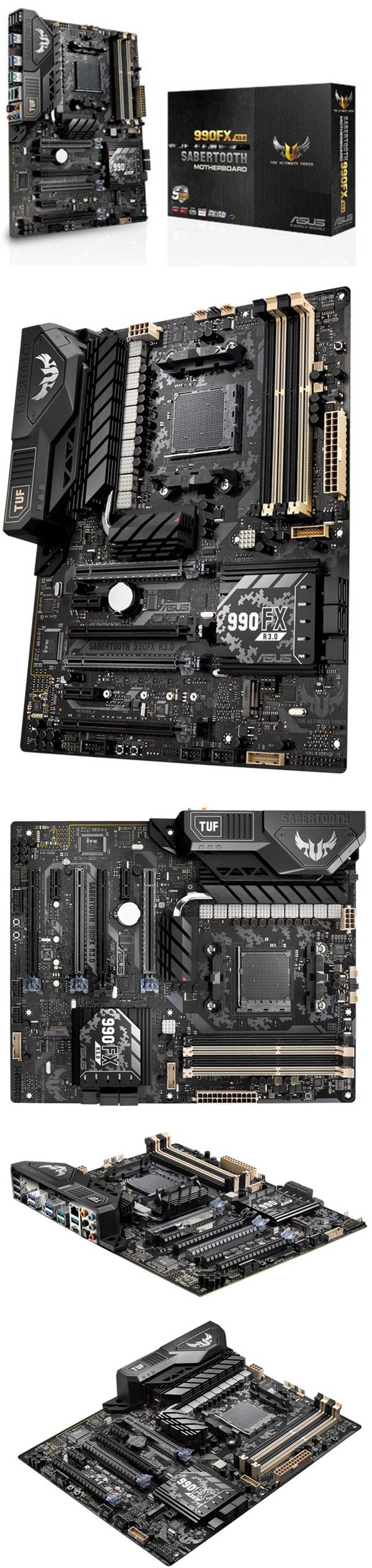 Устройство называется TUF Sabertooth 990FX R3.0, оно основано на чипсете 990FX от AMD и южном мосте SB950, создано для процессоров FX и чего послабее. Устройство питается от 24-пинового ATX и 8-пинового EPS коннекторов, имеет 10-фазовый VRM, преспокойно работает с обладающими чудовищным TDP в 220 ватт процессорами серии FX-9000.