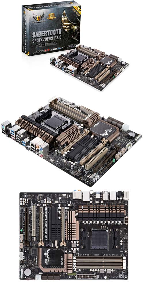 Плата Sabertooth 990FX GEN3 R2.0 относится к семейству устройств TUF, изделие рассчитано на энтузиастов. В основе нового творения ASUS лежит связка из чипсета 990FX и южного моста SB950. Совместимо сие чудо техники с процессорами с сокетами AM3+ и AM3.