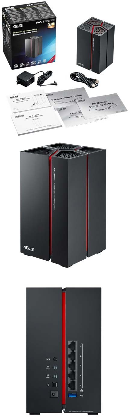 Изделие получило название RP-AC68U, оно выполняет сразу три функции: репитера, точки доступа и медиа моста. Аппарат поддерживает стандарты связи 802.11a/b/g/n/ac WiFi, скорость передачи данных составляет до 1900Мб/с (600+1300 Мб/с, Dual Band режиме 2.4/5ГГц), создано для больших домов или же гигантских квартир. Для тех, кто желает организовать надёжную защищённую проводную сеть имеются пять Ethernet портов, все они гигабитные.