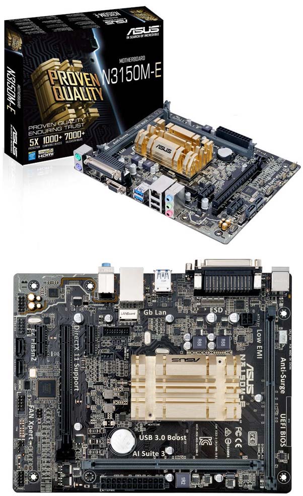 Аппарат именуется N3150M-E, форм-фактор изделия - microATX. В новинку интегрирован процессор/SoC Intel Celeron N3150 (Braswell), этот созданный по 14нм тех.процессу использует графическое решение с 12EU, четыре процессорных ядра архитектуры Airmont, а также двухканальный контроллер памяти DDR3L-1600. TDP решения составляет 6 ватт, охлаждение полностью пассивное.