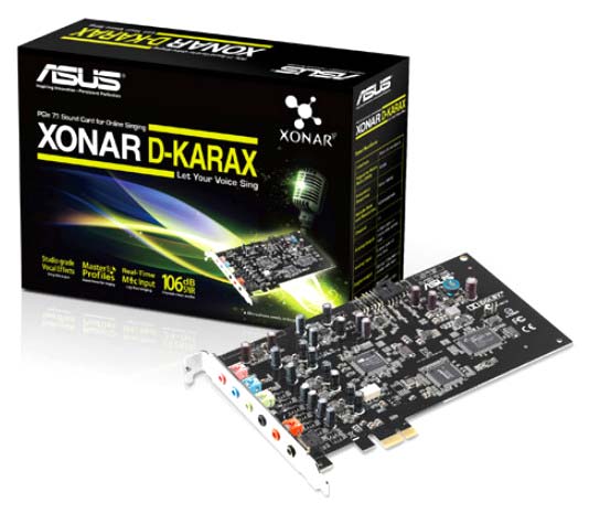 Вторая новинка от ASUS - PCIe (x1) звуковая карта Xonar D-KARAX, ориентирована которая не на геймеров, а на тех, кто считает свой голос чем-то особенным, говоря проще - на певцов и певиц. Как ни странно, изделие также поддерживает 7.1 звук, имеет семплинг рейт 24-бит/96кГц и отношение сигнал-шум 106дБ.