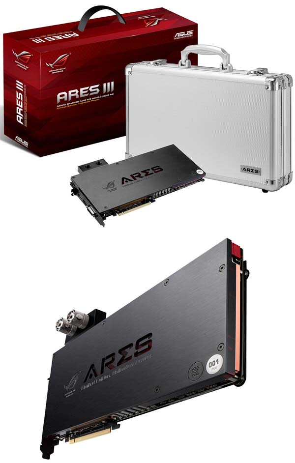 Аппарат получил имя ROG Ares III (модель ARESIII-8GD5), он представляет собой видеокарту, использующую пару графических чипов AMD Radeon R9 290X, общий объём GDDR5 памяти равен 8ГБ, работает она на тактовой частоте 5000МГц, шина используется 512-битная. Графические ядра функционируют на 1030МГц, для подключения используется PCIe 3.0 x16.
