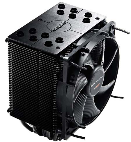 Прошлый продукт этой немецкой компании весил аж 1550 граммов, данную новинку особо лёгкой тоже не назовёшь - 1100 граммов. Кулер башенного типа, состоит из медного основания, шести 6мм теплотрубок и 44 алюминиевых пластин радиатора. Продувкой конструкции занимается 120мм вентилятор Silent Wings с PWM-управлением (скорость вращения - 900/1250/1500 оборотов в минуту, шум - 6.6/14.4/18.8 децибел, соответственно), указан даже срок службы "вертушек" - 300 тысяч часов, используемый тип подшипников - гидродинамический. Основание радиатора - медное, никелированное. Конечно же, заявлена полная совместимость с большим количеством платформ, как Intel (LGA 775/1155/1156/1366), так и AMD (AM2/AM2+/AM3/754/939/940).