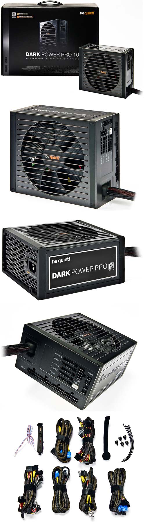 Серия называется Dark Power Pro 10 и включает в себя несколько моделей, мощностью от 550 до 1200 ватт (а конкретно - 550, 650, 750, 850, 1000 и 1200). Нам, помимо использования высококачественных компонентов и высочайшей эффективности (имеются сертификаты 80 Plus Gold и Platinum), обещают невероятно тихую работу этих блоков питания. Заявлено, что используемая особая 135мм версия вентилятора SilentWings на 850 ваттной модели шумит на уровне 12дБ вплоть до 90% нагрузки, а у 550 ваттной модели при полной нагрузке шум не превышает 14дБ. Я сейчас как раз выбираю БП взамен своему Enermax Pro 82+ (625 ватт) и ищу именно тихое решение, потому подобные показатели просто не могут не вызывать восхищение у меня.
