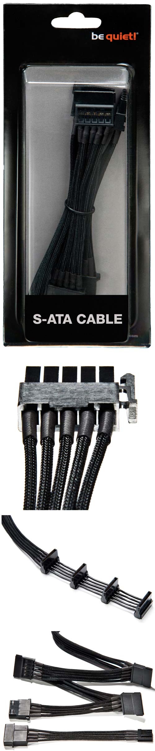 Помимо того, что кабели в индивидуальной оплётке выглядят лучше обычных, они ещё и являются более гибкими, по сравнению со своими более часто встречающимися аналогами. Продукция be quiet! представлена с количеством SATA коннекторов питания от одного до четырёх, также есть вариант с молексами и даже коннектором доя флоппи-дисковода. Каждый кабель представлен в двух вариантах - с расстоянием до первого коннектора в 300мм и 600мм, все изделия совместимы с ранее выпущенными блоками питания Dark Power Pro P8, Straight Power E9, Pure Power L8 и грядущими БП Power Zone.