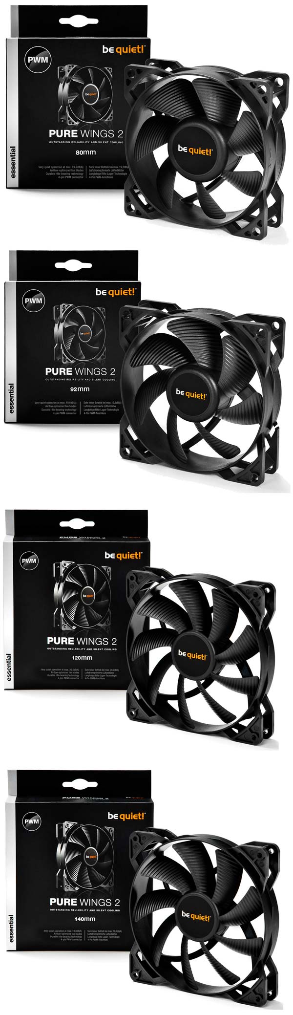 В линейку Pure Wings 2 PWM вошли вентиляторы типоразмеров 80, 92, 120 и 140 миллиметров, сообщается, что первые две модели работают на скорости в 1900 об/мин, 120мм - на 1500 об/мин, а 140мм - на 1000 об/мин, уровень шума составляет от 19.2 до 20.2 децибел. "Карлсоны" сгодятся как для использования в качестве корпусных, так и для охлаждения радиаторов различных систем охлаждения.