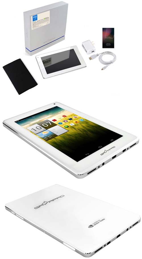 У планшетника Galapad имеется слот для карточек SD/SDHC (32ГБ карточки - максимум, что поддерживается), фронтальная 2МП камера, поддержка WiFi и Bluetooth 3.0 с GPS, 12-ядерное графическое решение. Размеры корпуса изделия: 196x122x9.9, вес - 320 граммов. Управляется планшет всем нам знакомым Android 4.1, а питается от литий-ионной батареи на 3500 мАч. Аппарат оснащён Micro HDMI видеовыходом, Micro-USB портом и 3.5мм выходом на наушники.
