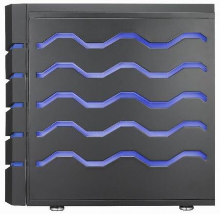 Сборка ПК в этом корпусе (это относится только к установке PCI устройств и накопителей с оптическими приводами) осуществляется в режиме tools free (без инструментов). В передней части шасси находится 230мм вентилятор, призванный обдувать все внутренности ПК, начиная с винчестеров. Стоит отметить, что присутствует LED подсветка, выполненная довольно оригинальным методом. Это хорошо видно на фотографиях чуть ниже. Без хлопот в данный корпус вместятся материнские платы форматов Mini-ITX, mATX, ATX или же E-ATX.