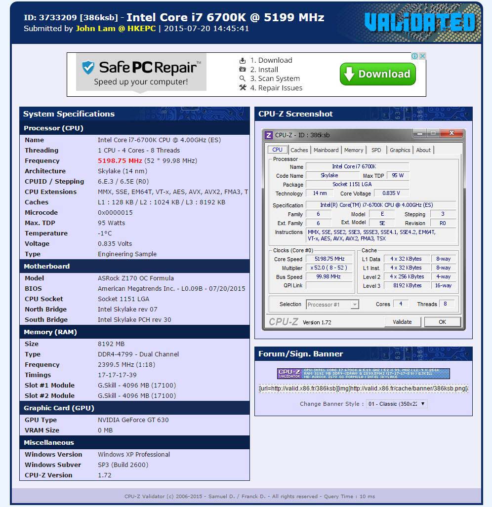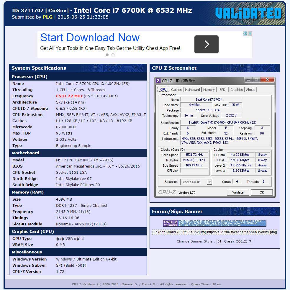 Как видно, результат выше получен на системной плате MSI Z170A Gaming 7 при напряжении на процессоре в 1.35 вольт, вероятно использовалось воздушное охлаждение. Ниже разгон был проведён не без помощи жидкого азота и платы ASRock Z170 OC Formula.