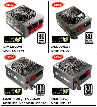 Platimax имеют один из самых высоких показателей эффективности среди серийно выпускаемых блоков питания - 94% (80 Plus Platinum), в них используются качественные компоненты, названия которых я даже не возьмусь переводить. Применены типичные для продуктов Enermax технологии SafeGuard и HeatGuard, за охлаждение отвечает 13.9мм вентилятор с Twister подшипником. Количество линий 12V - от четырёх до шести, что как-то неожиданно, я думал будет одна. Моделей будет выпущено большое количество, мощностью от 600 до 1200 ватт.