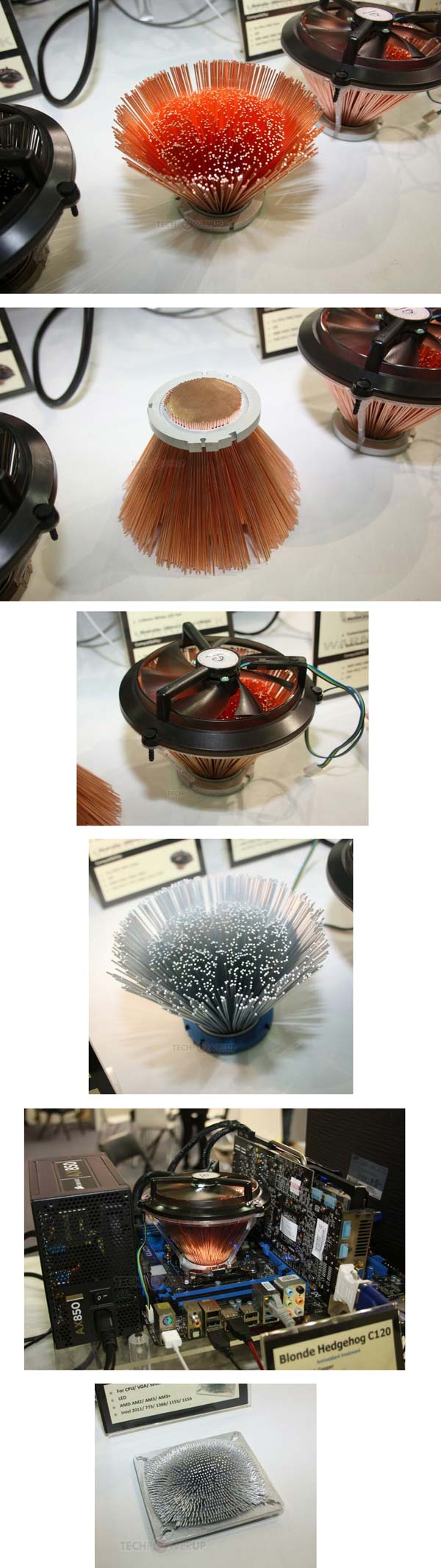 Первый кулер называется Blonde Hedgehog C120, он представляет собой радиатор, смахивающий на одну из принадлежностей в арсенале опытного цирюльника, такой штуковиной обычно наносят пену для бритья, только вместо ручки у изделия медное основание (не сплошное, а спрессованное из медных проволок), а вместо щетины - медные проволоки (из них и сделано основание, без применения сварки). Конструкция имеет габариты 140х140х90мм, сверху на ней покоится 120мм вентилятор, что её и продувает.