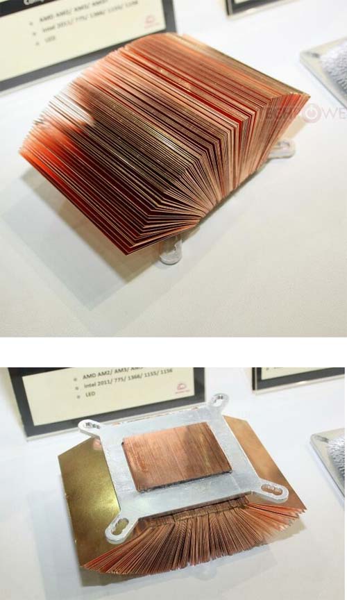 Вторая система охлаждения называется Pangolin ("Ящер") C1-6 и представляет собой также необычную конструкцию, описать которую можно примерно так - книжка, поставленная на переплёт в полураскрытом состоянии. Только страницы в этой книге медные и имеют прямой контакт с крышкой теплораспределения процессора. В конструкции пока не предусмотрено крепление для вентилятора, но оно обязательно появится в будущем. Как и "Блондинистый ёжик", данное изделие создано без применения сварки.