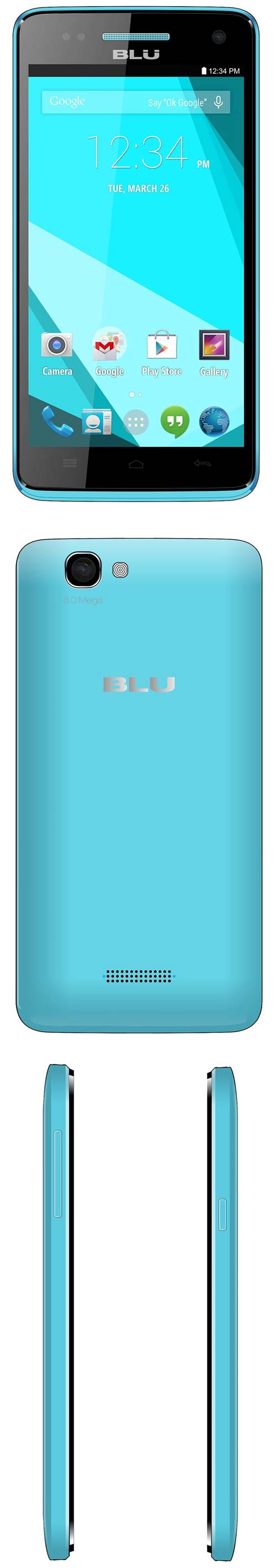 Нам поведали о наличии у смартфона 8МП тыловой камеры с LED вспышкой и автофокусом, а также о наличии у него 2МП фронтальной камеры. Изделие BLU поддерживает Bluetooth, WiFi, работает в сетях 4G (HSPA+ 21Мб/с), питается от батареи на 2000 мАч, имеет размеры 5.1x3.4x0.4", весит 13.6 унции.