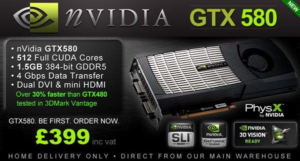 83 градуса в FurMark - совсем не плохо, я считаю. Надеюсь уровень шума при этом и вправду ниже оного у GTX480. Стоит ещё упомянуть о доступности карт. Их ещё нет в продаже, но в Лондоне уже можно оформить предварительный заказ, что и сделали некоторые товарищи-оверклокеры, жители туманного Альбиона. Одна 580-ка обошлась им в ~400 фунтов стерлингов, что примерно равно 670 долларам США (конвертировали по курсу они сами, я проверять не стал). Недешёвое удовольствие, как и предполагалось ранее.