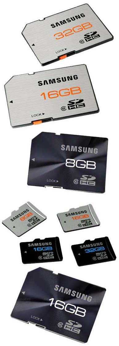 Южнокорейский гигант представил целый набор различных карт семейства SD, показал всё, кроме SDXC решений. Из характеристик называется только обозначенный довольно расплывчато показатель чтения и записи - до 24МБ/с. Я подозреваю, что скорость там явно не такая, записи - уж точно. Но не характеристики выделяют новинки среди подобных продуктов, а их дизайн - я ничего подобного не видел. Вот, полюбуйтесь: