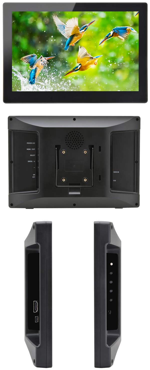 Источником сигнала может быть что угодно с видеовыходом HDMI. В монитор встроен один 1-ваттный динамик. Размеры решения: 252x175x33мм, вес равен 850 граммам. Энергопотребление составляет от 2.9 до 4.7 ватт, в зависимости от настроек яркости подсветки. Питается LCD-10000HT от порта Micro USB.