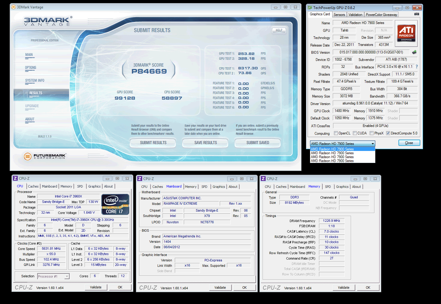 Рекорд был поставлен в дисциплине 3DMark Vantage, с помощью четырёх видеокарт HIS Radeon HD 7970 X, охлаждаемых с помощью СВО и жидкого азота (хотя на HWBOT написано что только СВО). Помимо видях, тестовый стенд состоял из процессора Core i7-3960X, разогнанного (не без жидкого азота) до 5631.81МГц, оперативной памяти Patriot Viper Xtreme Division 4, работавшей на частоте 1229МГц при таймингах CL7-11-10-30 2T, материнской платы ASUS Rampage IV Extreme и блока питания Antec High Current Pro 1200 ватт.