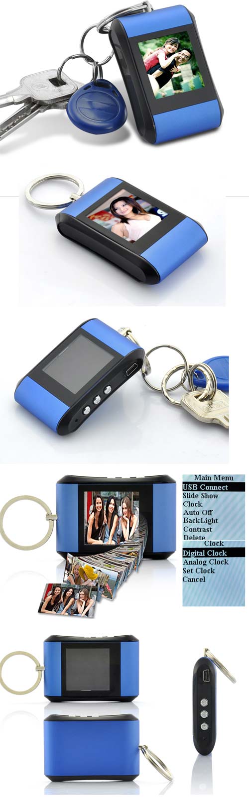 Устройство именуется CVGB-F44 и представляет собой небольшой (60x40x15мм) брелок для ключей, в котором расположен 1.5" CSTN (технология Color Super Twist Nematic) цветной ЖК экран с разрешением 128х128 пикселей. В память устройства, коей "аж" воесь мегабайт, можно закачать до 107 изображений в форматах JPG, BMP или же GIF. Подключение к ПК осуществляется по USB 2.0, питанием устройства занимается 3.7 вольтная литий-ионная батарея, зарядить которую можно по USB.