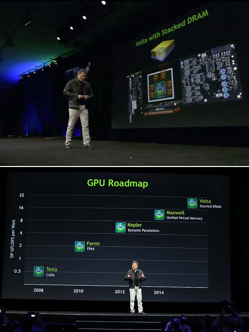 Maxwell предложит интересную "фичу" - единую виртуальную память, позволяющей системе использовать память видеокарты в качестве оперативной. Через год (или больше) после Maxwell нам покажут Volta, в ней будет реализована технология, которую обозвали stacked DRAM. Модули памяти будут поставлены поверх графических ядер Volta, обеспечивая пропускную способность свыше 1 терабайта в секунду. Я не особенно понимаю, как это реализовано, да и за 2 года до выхода Volta всё ещё может многократно поменяться, поэтому не советую ломать головы над этой "фичей".