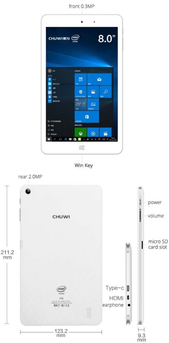 Экран устройства 8-дюймовый, разрешение составляет 1920x1200, IPS экран ёмкостного типа. Размеры аппарата: 211.2x123.2x9.6мм, вес - 150 граммов, питается новинка от батареи на 4000 мАч, оснащена 2МП тыловой и 0.3МП фронтальной камерами. Есть сведения о поддержке 802.11b/g/n WiFi и Bluetooth 4.0, о наличии порта USB Type-C, OTG, 3.5мм аудиовыхода и видеовыхода HDMI 1.4.