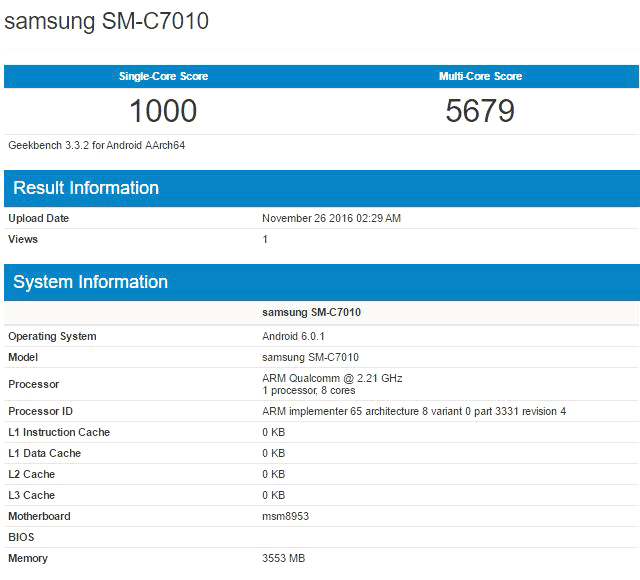 Недавно готовящийся к релизу 5.7" планшетофон Samsung Galaxy C7 Pro (SM-C7010) побывал в тестовой программе Geekbench, результаты выступления можно оценить ниже: