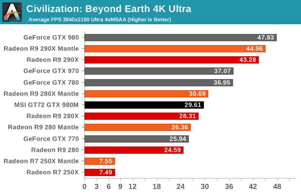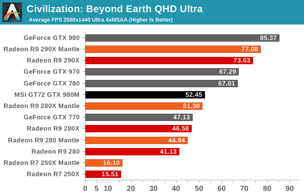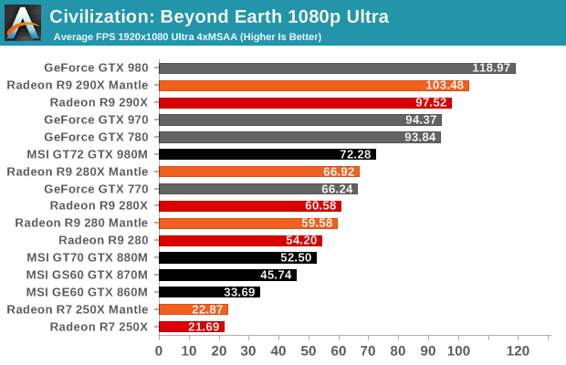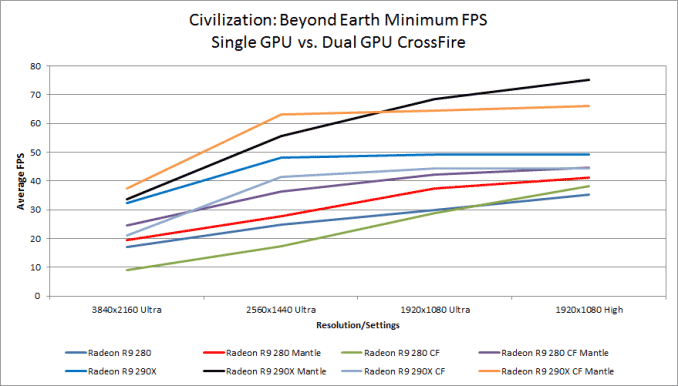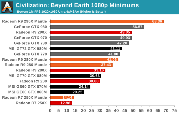 Стоит отметить, что тесты проводились не на финальной версии игры, поэтому в некоторых случаях (на некоторых конфигурациях) Civilization: Beyond Earth вела себя странно. В материале отмечается положительное влияние применения технологии Mantle, весьма значительно увеличивающей минимальный FPS - на 40-50%. Игра будет идти весьма хорошо на ПК с видеокартой уровня GTX 770 и R9 280 в разрешении Full HD и добротными настройками графики.
