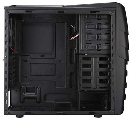 Шасси может похвастаться четырьмя 5.25" отсеками и шестью местами для 3.5 дюймовых накопителей (крепятся которые без доп.инструментов). Производитель уверяет, что внутрь шасси влезет видеокарта длиной до 390мм, при условии что одна из корзин для винчестеров будет снята. На панели ввода/вывода имеются порты USB 2.0 и 3.0 - по два, а на задней стенке расположены три отверстия для шлангов СВО/СЖО. Производитель предустановил два вентилятора - 120мм на заднюю стенку, его скорость вращения составляет 1200 оборотов в минуту и 200мм, он находится на "морде" шасси и работает на 1000 об/мин, да ещё и светится красным (за что отвечает светодиод).