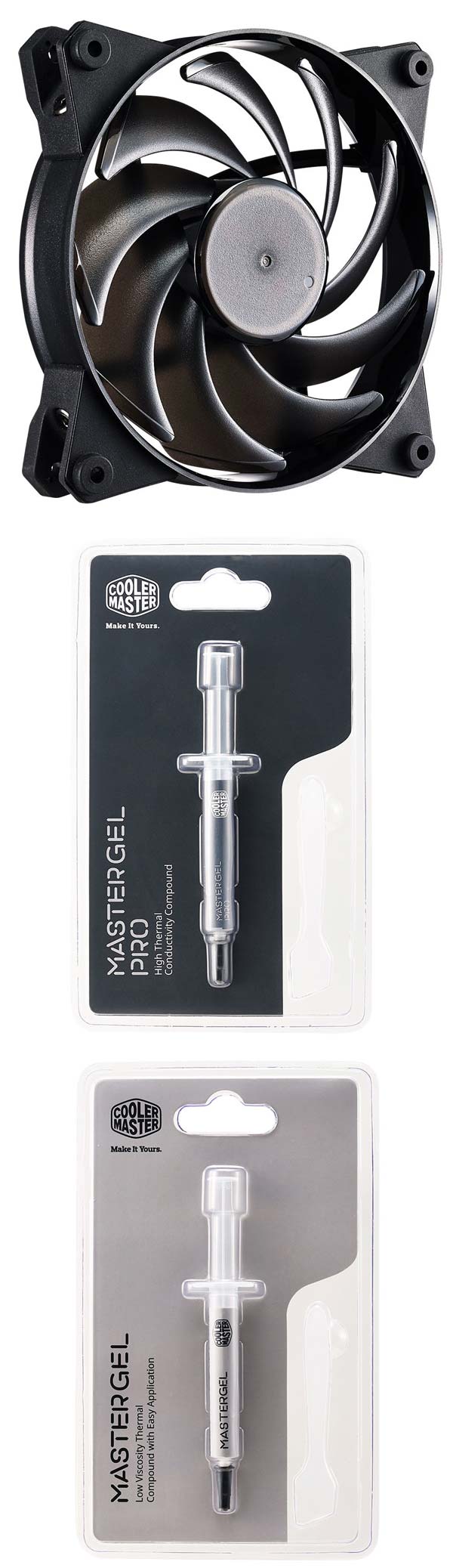 На фото показаны вентиляторы MasterFan Pro и термопаста MasterGel / MasterGel Pro