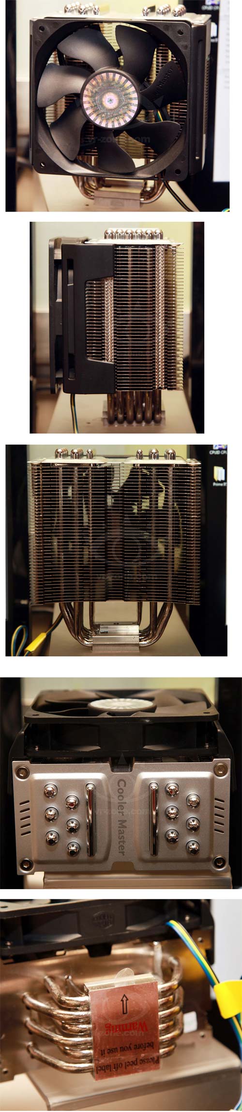 Мудрецы из Cooler Master решили присобачить испарительную камеру к обычному кулеру башенного типа. Я долго старался понять, каким же образом работает устройство, но прозрение так и не коснулось меня своей дланью. Одно я понял - испарительная камера находится над теплообменником (и с ним соединена) и как-то контактирует с алюминиевым радиатором (тоже теплотрубками?), обдуваемым 120мм вентилятором (уверен, что шумным на максимуме оборотов). Теплотрубок в устройстве шесть штук, говорится, что изделие может отвести до 240 ватт тепла, что не впечатляет меня лично вообще никак.