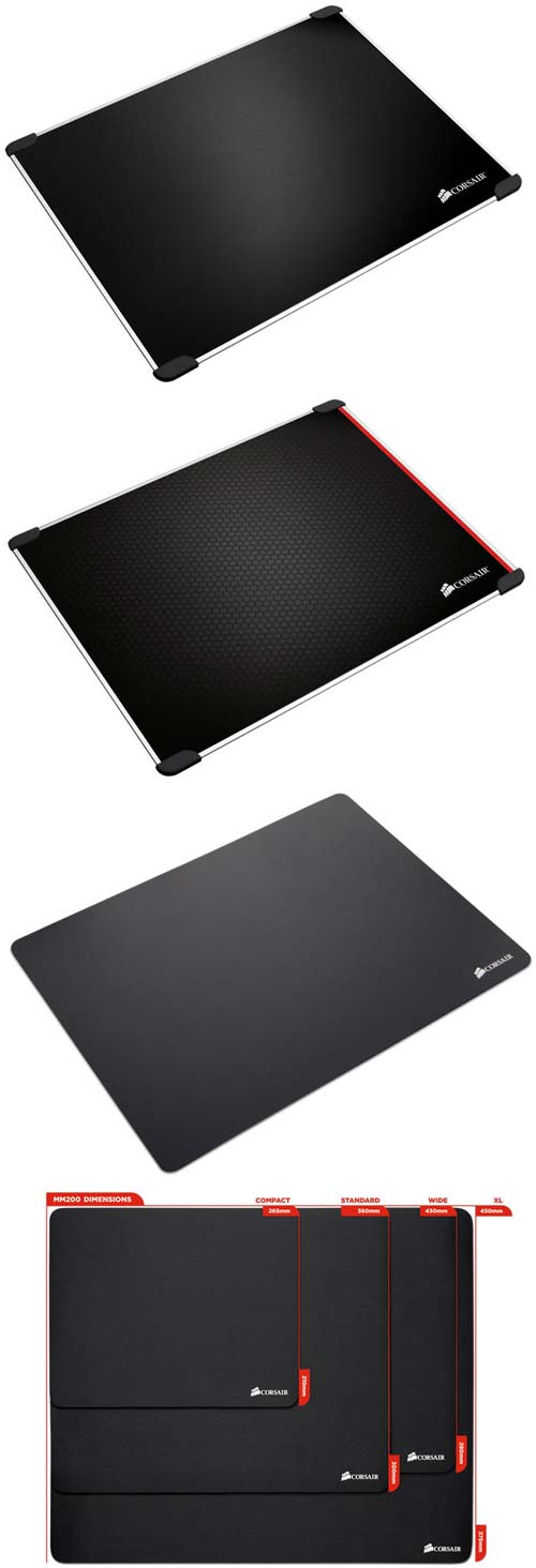 Что касается MM200, то он поставляется в разных вариантах, показанных на фото выше: стандартный (352x272мм), компактный (265x210мм), широкий (430x280мм) и XL (450x375мм), толщина всех вариантов - 2мм. Стоимость новинок компания Corsair не открыла публике.