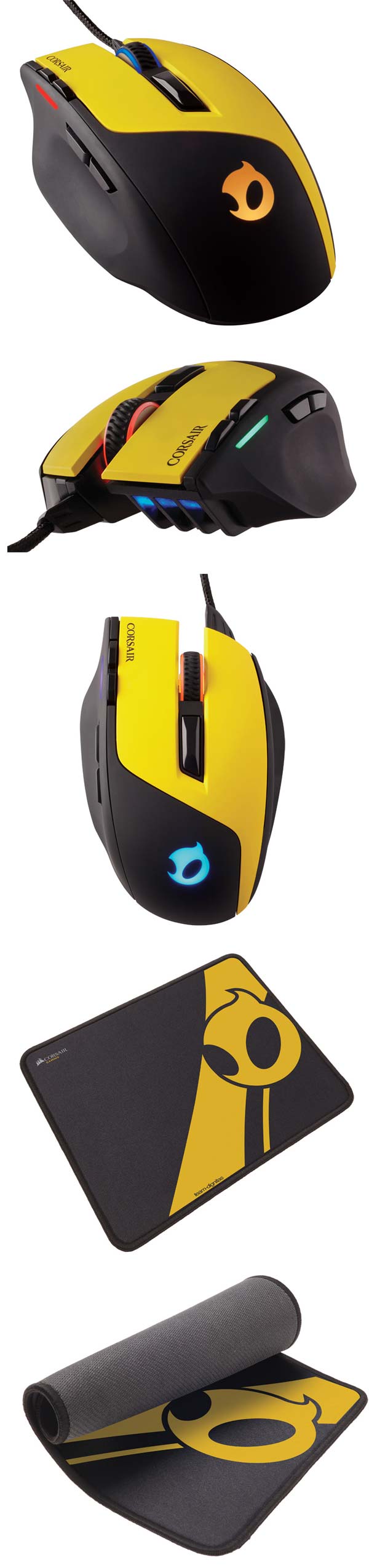 Вес манипулятора равен 100 граммам, настройка имеющего эргономичную форму устройства осуществляется через софт Corsair Utility Engine (CUE), в аппарате используются высокопроизводительные переключатели, подключение осуществляется по 1.8-метровому кабелю USB, частота опроса сенсора - 1000Гц. Цвета мышки достались от Team Dignitas, ровно как и логотип.
