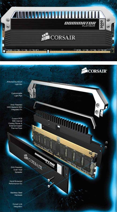 В обозримом будущем на прилавках магазинов появятся продукты серии Dominator Platinum, первый представитель которой будет функционировать на тактовой частоте в 3ГГц. Модули будут доступны в виде наборов по 2 и 4 планки (для двухканального и четырёхканального функционирования). Память будет отличаться от прочих творений Corsair особенно навороченной системой охлаждения, в схеме которой я даже не пробовал разобраться, но ясно одно - перегрев Dominator Platinum не грозит.