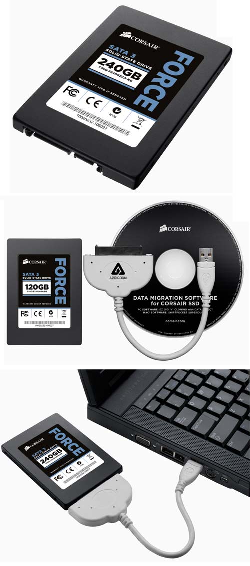 По-сути, нам предлагают нечто вроде Upgrade Kit (набора для апгрейда), состоящего из самого SSD серии Force 3, специального устройства от Apricorn, что позволяет подсоединить SSD к ПК по USB (так будет делаться копия винчестера на SSD), а также софта (Apricorn EZ GIG IV), с помощью которого переход с медленного винчестера на быстрый SSD будет плёвым делом.