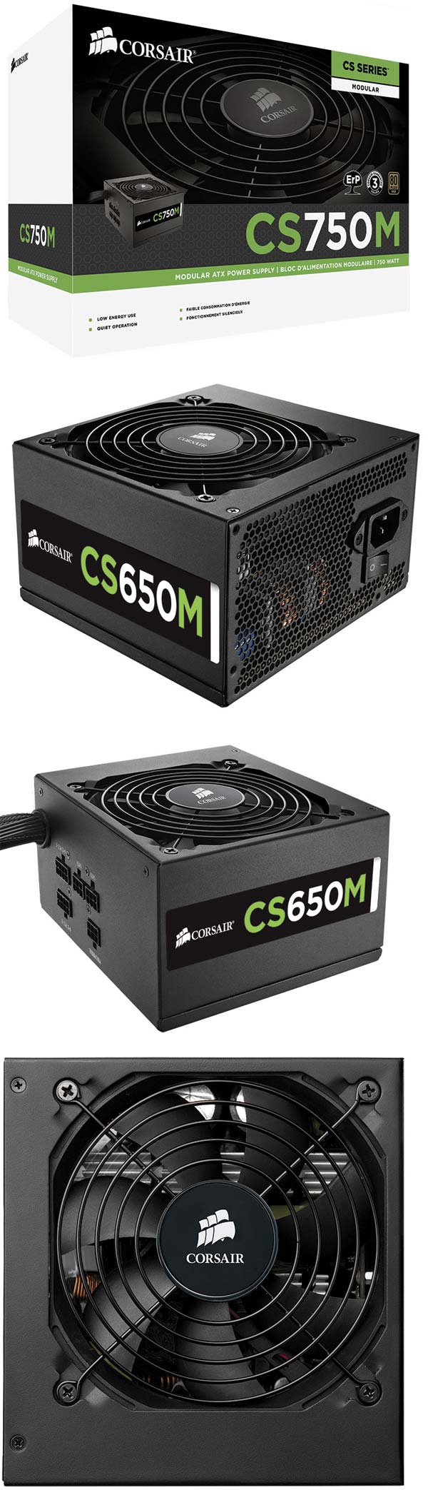Блоки питания частично модульные, отключить нельзя лишь базовые кабели (24-х пиновый ATX и 8-пиновый EPS). CS совместимы с процессорами Core четвёртого поколения и новинками от AMD, отвечают требованиям ATX последней версии. Охлаждение внутреннего пространства блоков питания серии осуществляется работающим на невысоких оборотах 120мм вентилятором на базе подшипника скольжения, срок службы которого равен 150 тысячам часам.