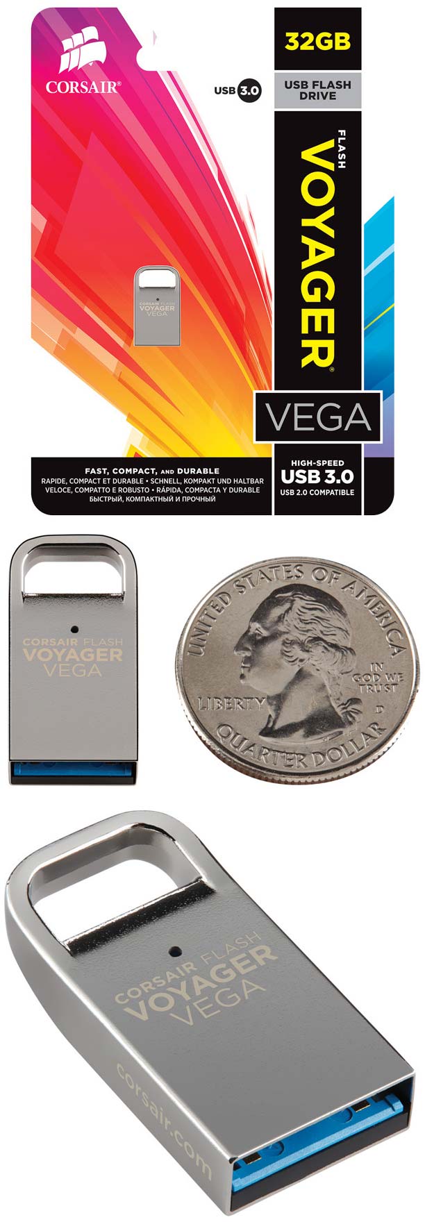 Семейство флешек называется Flash Voyager Vega, его представители подключаются по интерфейсу USB 3.0, однако скоростных спецификаций аппаратов нам не называют. Ёмкость изделий серии составляет 16, 32 и 64 гигабайта, вес каждого накопителя равен 3 граммам. Толщина корпусов изделий Corsair составляет 5мм, длина - 24мм.