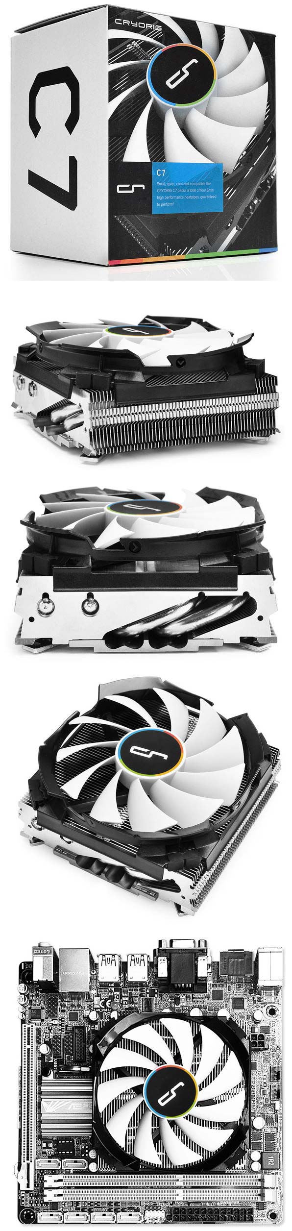 Аппарат именуется C7, обладает скромными размерами 97x97x47мм и весом в 357 граммов с учётом вентилятора. В радиаторе используется 57 алюминиевых пластин, толщина каждой составляет 0.4мм, зазор между ними - 1.2мм, пластины связаны с медным (C1100) основанием шестью 6мм теплотрубками.