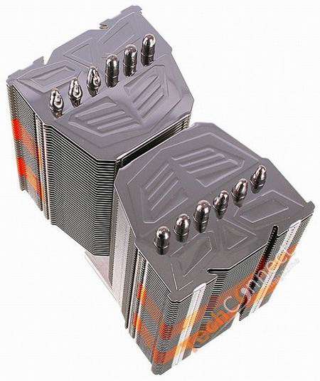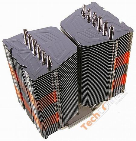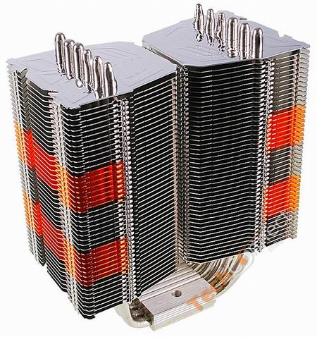 Раз уж характеристики известны (габариты новинки - 130x74x158.7мм, вес - 945.3 грамм. Из никелированного медного основания идут шесть 6-и миллиметровых теплотрубок, пронизывающих огромное количество радиаторных рёбер (большинство из которых алюминиевые, но есть и медные). На радиатор можно навесить пару 120/140мм вентиляторов (пока не ясно будут ли какие-либо "вертушки" в комплекте), а для слабых процессоров (с невысоким уровнем тепловыделения) можно обойтись и без них) перейдём сразу к новым данным. В комплекте мы получим тюбик термопасты PK-1 и всё необходимое для установки радиатора на процессоры LGA 775/1156/1366, а вот крепления для AMD AM2(+)/AM3 придётся либо докупать отдельно, либо мастерить самому