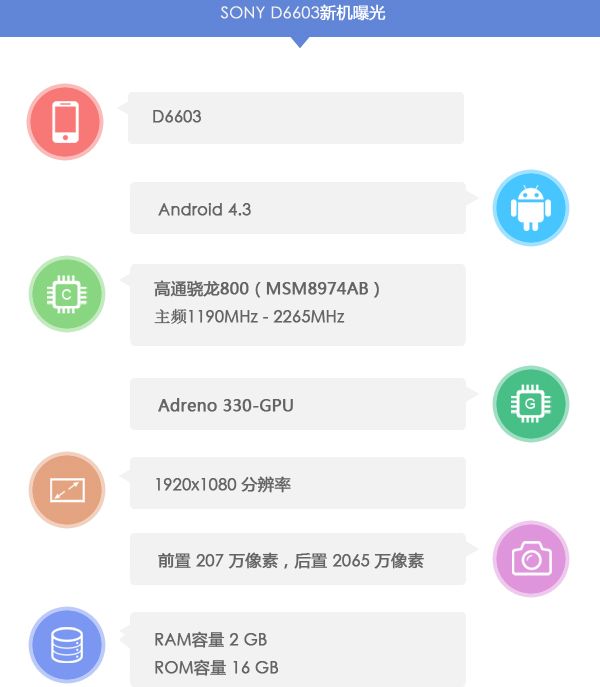 В этот раз до нас хотят донести, что наследником Z1 станет аппарат, ныне имеющий лишь кодовое название D6603. Внутри этого девайса работает улучшенный вариант 2.3ГГц Snapdragon 800 (MSM8974AB) от Qualcomm, 2ГБ оперативной памяти, 16ГБ флеш памяти, а управляет всем эти Android 4.3. Тыловая камера у изделия будет обладать фирменным 20.7МП сенсором от Sony, так что качество снимков и видео будет на высоте.